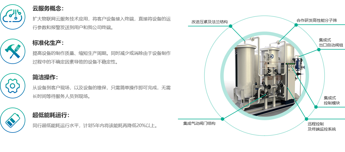 通過優化變壓吸附的工藝和過程控制,同純度下可提升制氮機的產能30%-80%,同流量下可實現制氮機純度的提升(如99.9%提升到99.99%,99.99%提升到99.999%);通過節能控制系統,可解決制氮機在小流量情況下能耗大的問題,可節約空壓機電耗10%-60%。